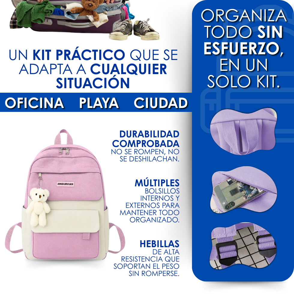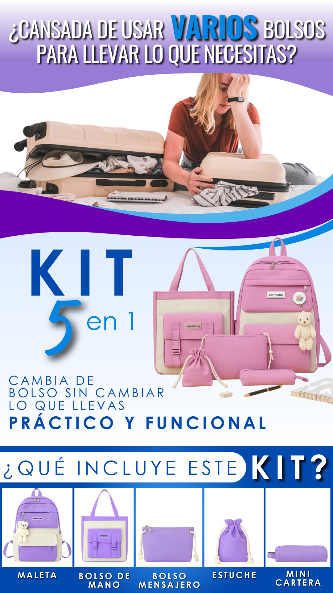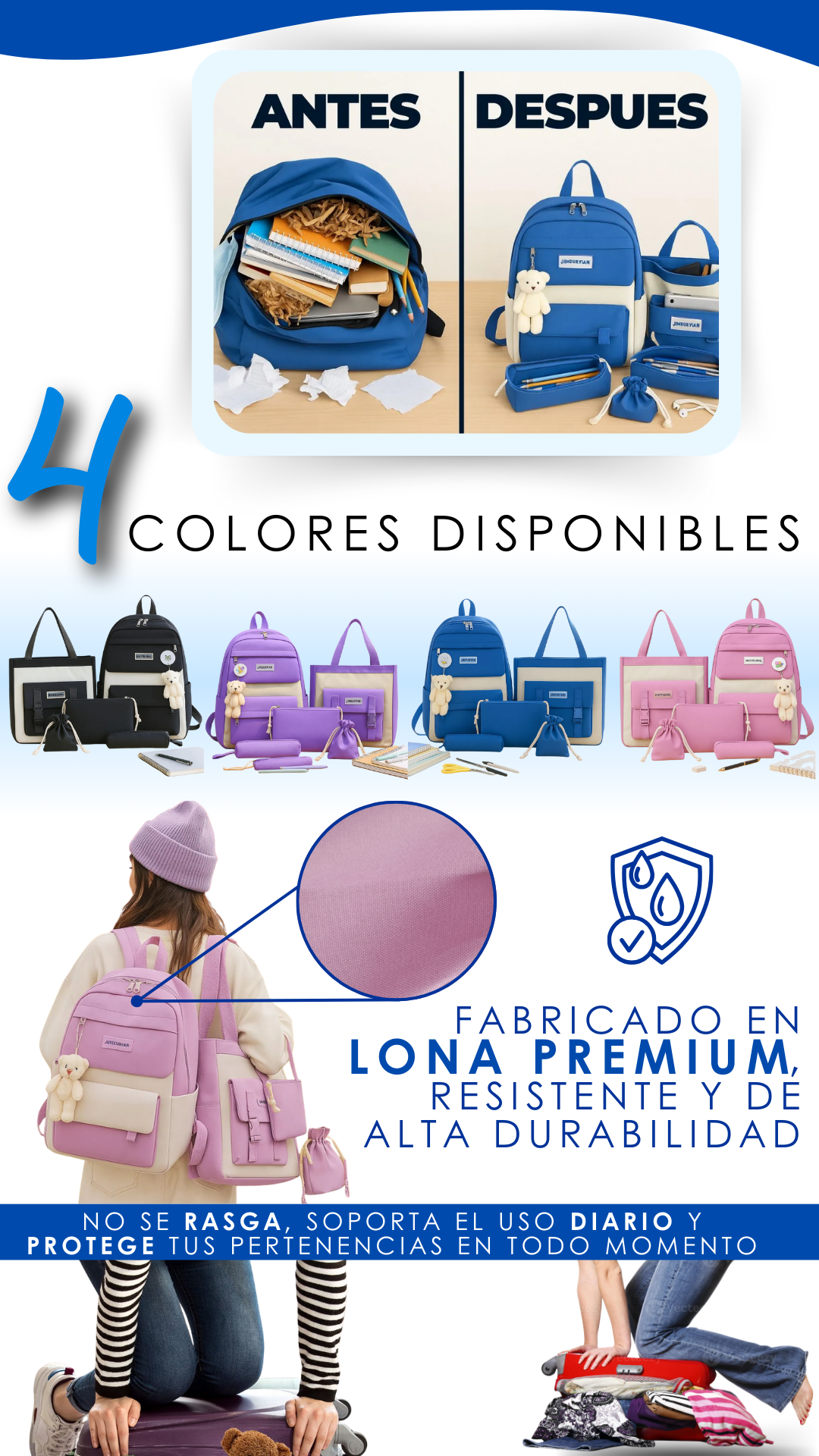 Con el Kit Mochila 5 en 1 tienes un bolso perfecto para cada ocasión: mochila, bolso de mano, lonchera, cartuchera y más. Todo organizado, ligero y sin esfuerzo.