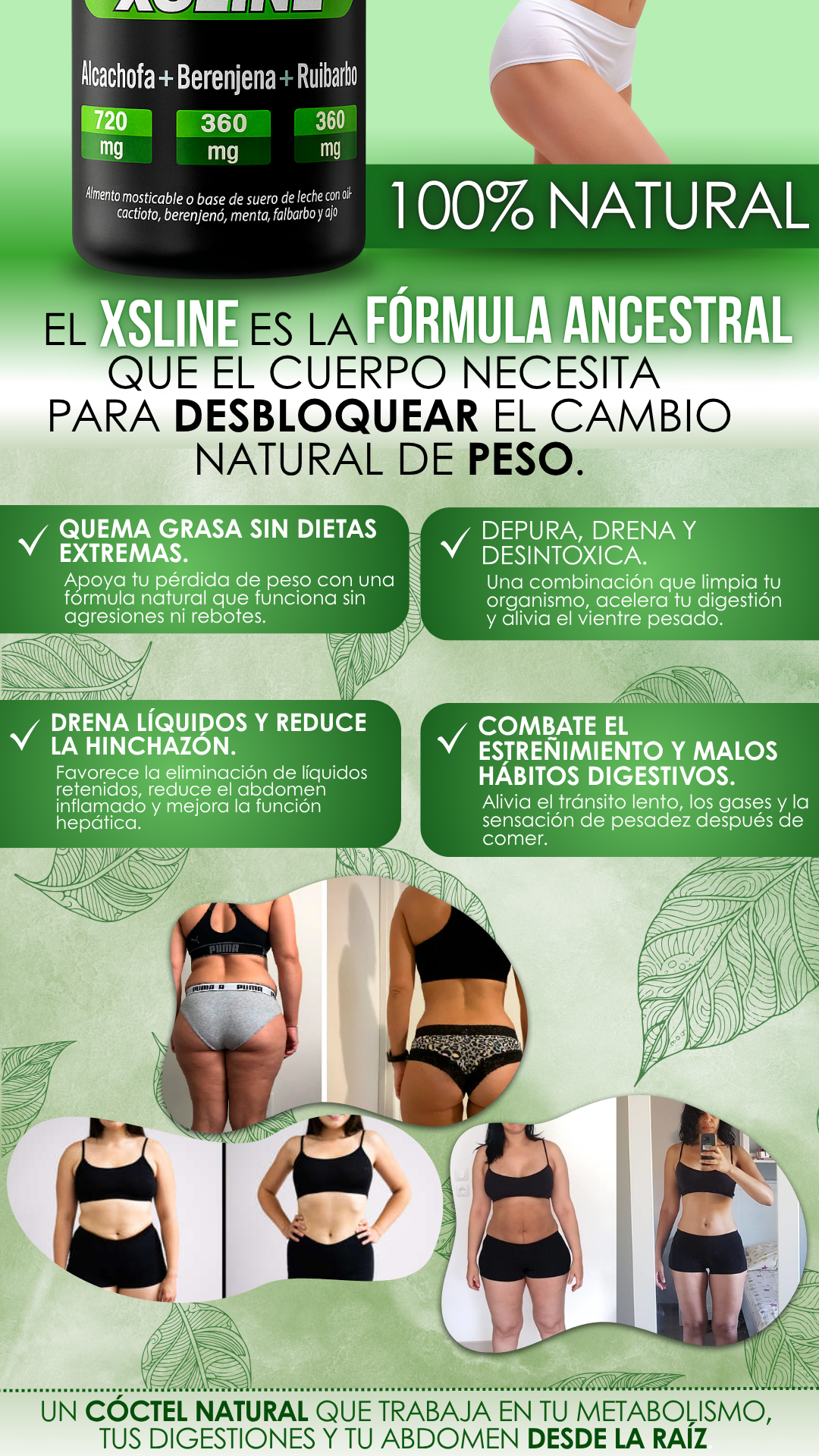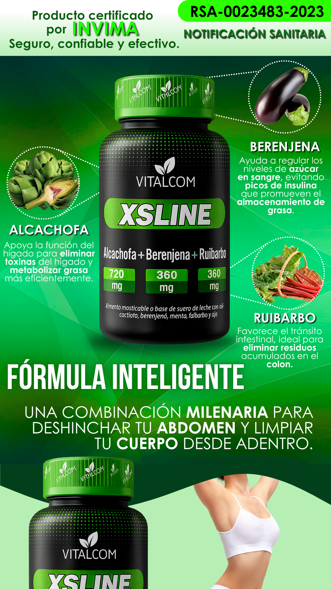 XSLINE es un suplemento natural formulado con alcachofa, berenjena y ruibarbo, diseñado para apoyar la pérdida de peso, reducir la hinchazón abdominal, mejorar la digestión y favorecer la depuración del cuerpo de forma natural y sin químicos agresivos.